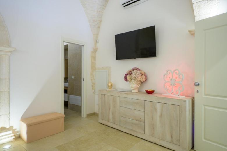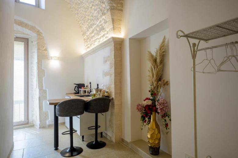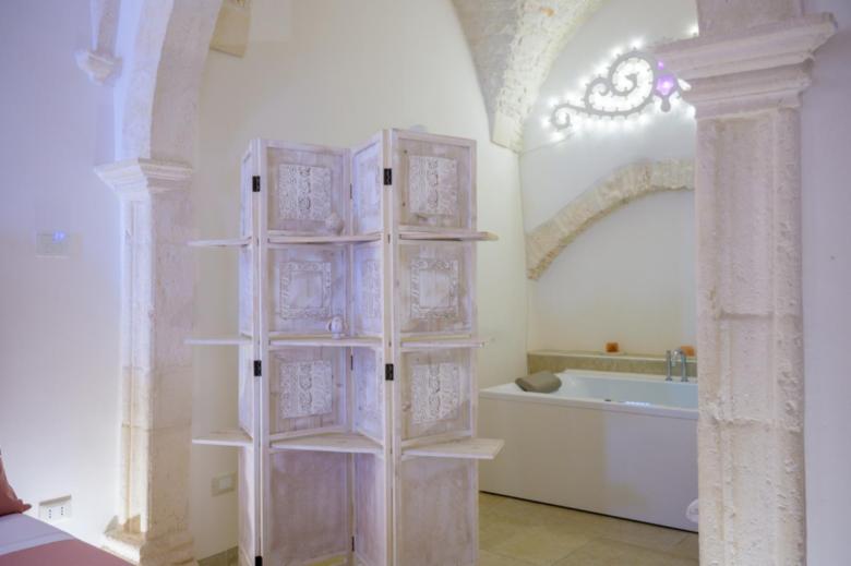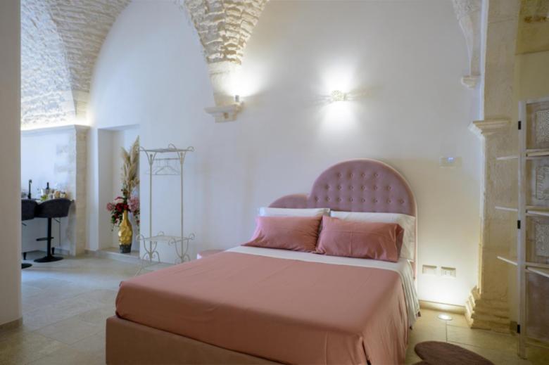 1. La camera “Suite”, ideale per una coppia, è composta da una stanza open space con letto matrimoniale, lavandino con isolotto, mini frigo, vasca idromassaggio e bagno privato. L’appartamento dispone di un impianto di riscaldamento e raffreddamento, macchina del caffè, smart tv, wi-fi gratuito e asciugamani per tutti gli ospiti. Colazione inclusa nel prezzo.