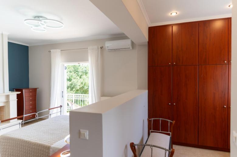 Ascend the marble stairs to the first floor, where the master bedroom awaits with its luxurious features. A queen-sized bed promises a comfortable night's sleep, complemented by a private ensuite bathroom with shower. A separate wardrobe area ensures plenty of storage space, while the room exudes elegance with its hand-carved fireplace, perfect for adding warmth and charm. Step out onto the balcony to enjoy stunning views, whether you're sipping morning coffee or relaxing with the sunset's glow. Two additional bedrooms with queen beds and balcony doors for natural light and scenic views, while a fourth bedroom provides flexible sleeping arrangements with two single beds that can be joined if desired. A generously sized bathroom with a Jacuzzi tub completes the first-floor amenities. Each bedroom is equipped with its own TV, air conditioning unit, and ample wardrobe space, ensuring comfort and convenience.
