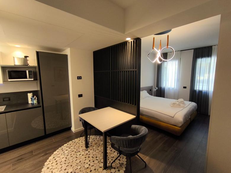 E' situato al piano terra della struttura Cremona Inn Aparthotel, con ingresso dal patio del giardino.