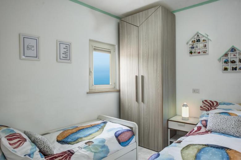 The master bedroom, simply and comfortably furnished, features a bright window. The second bedroom, also with a window, offers glimpses of Positano in the distance and is furnished with two single beds.