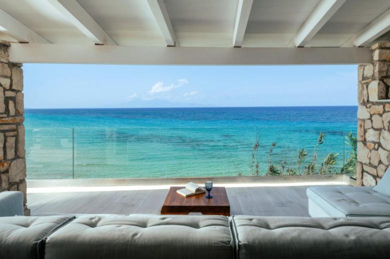 The facilities of the imposing Villa Bala feature a very spacious outdoor living area designed with the highest care awaiting to accommodate precious, memorable moments with friends and family. Guests can take a refreshing dip in the heated infinity pool with jacuzzi where the blue of the pool blends with the blue of the sea and the sky creating a unique, idyllic setting for moments of deep relaxation and tranquility, enjoying the summer sun on the sun loungers and other outdoor relaxing spots. The Villa also offers an outdoor shower, outdoor barbecue with wood fired oven where you can prepare any of your meals and dine in the large outdoor shaded dining area with the green of the garden, the tranquility of nature and the sound of cicadas to create indelible memories. At one corner of the outdoor area, right above the sea there is also a small contemporary guest house with interior stone elements and soothing colours reflecting the beauty of the surrounding environment consisting of a sofa bed, a bathroom and large windows overlooking the endless blue of the sea and a large furnished shaded veranda. Fitness equipment is also provided for the fit stars. Imagine sitting on the comfortable outdoor sofa enjoying the spellbinding beauty and tranquility of the natural landscape in the comfort of your own home; a unique relaxing spot for private contemplation or small intimate conversations. Villa Bala features a fully equipped outdoor bar, a few steps from the sea that further elevates the facilities offered, with a wide variety of wines and drinks and the ability to add labels of your choice and bar tender services upon request, the perfect gathering spot for refreshing drinks during the day, after dinner drinks and endless conversations with friends and family. On the green lawn right by the sea sun loungers and daybeds are offered allowing you to enjoy your swim and the summer sun away from prying eyes in tranquil grounds. Take a walk in the soft, golden sand, swim in the crystal clear waters, ideal for all ages, gazing at the endless blue of the Ionian Sea. The services of the villa include staff for daily cleaning and upon request, throughout your stay, additional services such as private chef, massage and private boat tour with the option of setting out from the sea in front of the Villa maximizing the unique staying experience in Villa Bala. The abundance of excellent facilities, services, the highly hospitable staff, its privileged location, within a fenced, private plot that literally touches the clear blue waters of the Ionian Sea make Villa Bala the Premium choice for your summer holidays.