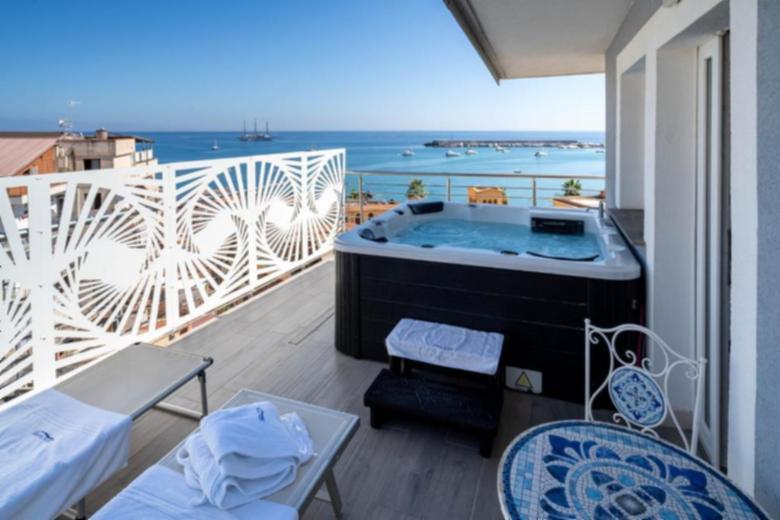 The bedroom features a double bed, a whirlpool tub with a sea view through a large window, bed linens, extra blankets and pillows, wardrobe and hangers, bedside tables, and a baby crib or travel cot available upon request. The bathroom is complete with shower and bidet, hairdryer, toiletries, and towels.