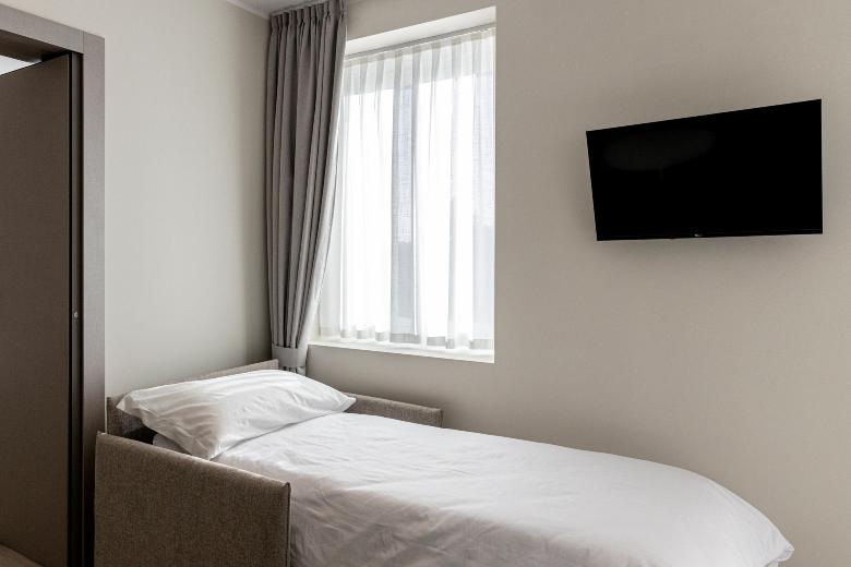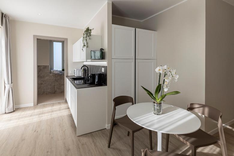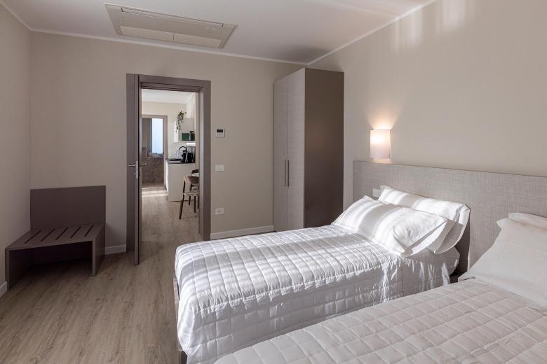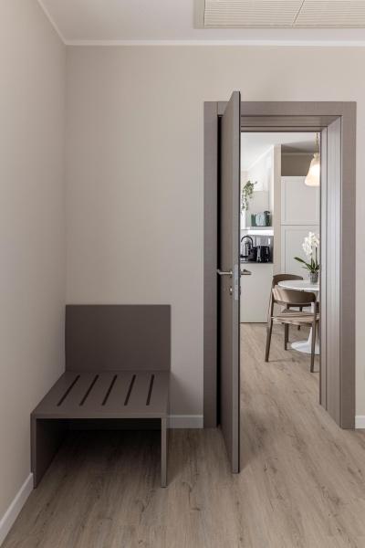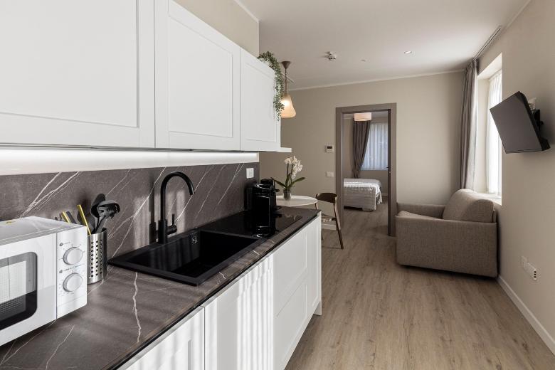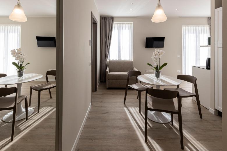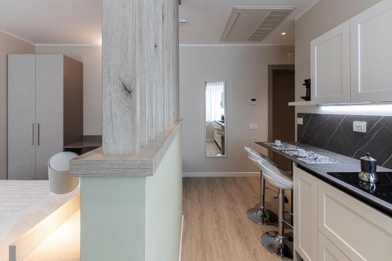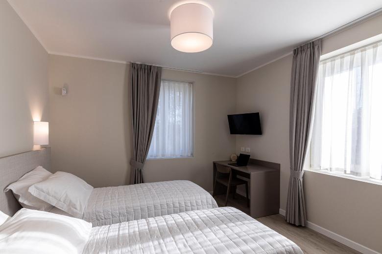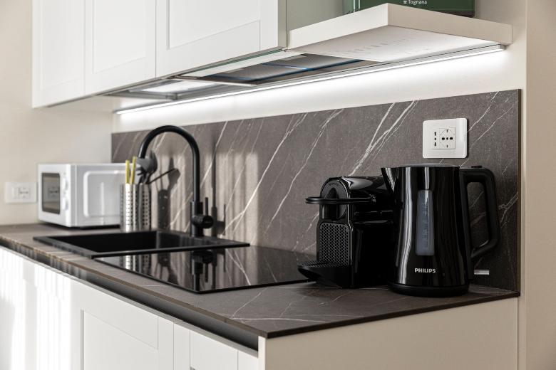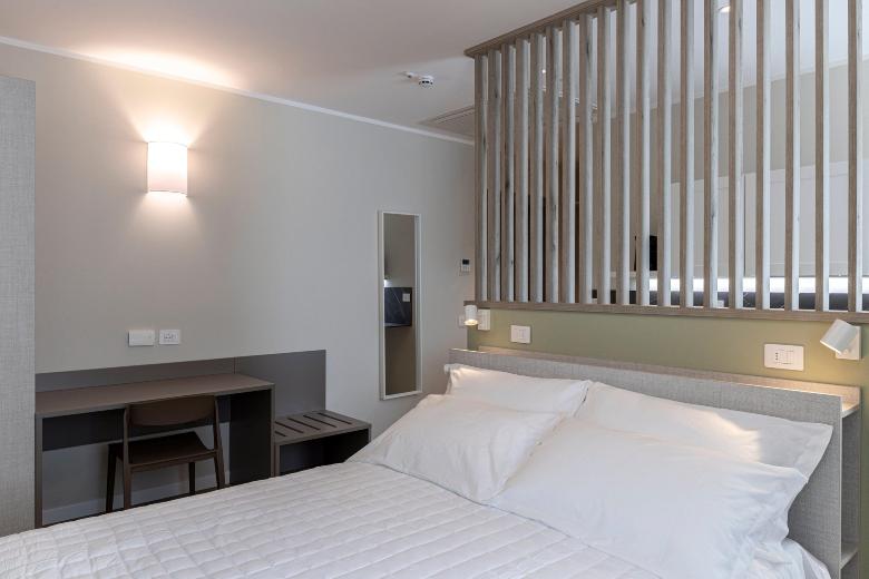 The double room is practical and functional, designed to offer all comforts within a compact yet optimized space. Equipped with a kitchenette, desk, and a modern, windowed private bathroom, it completes the accommodation by ensuring privacy and convenience. It’s the ideal choice for those seeking practicality without sacrificing style and comfort.