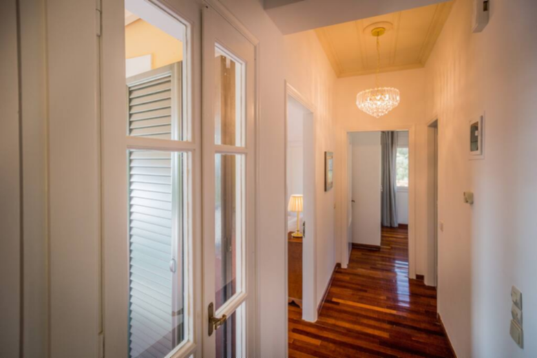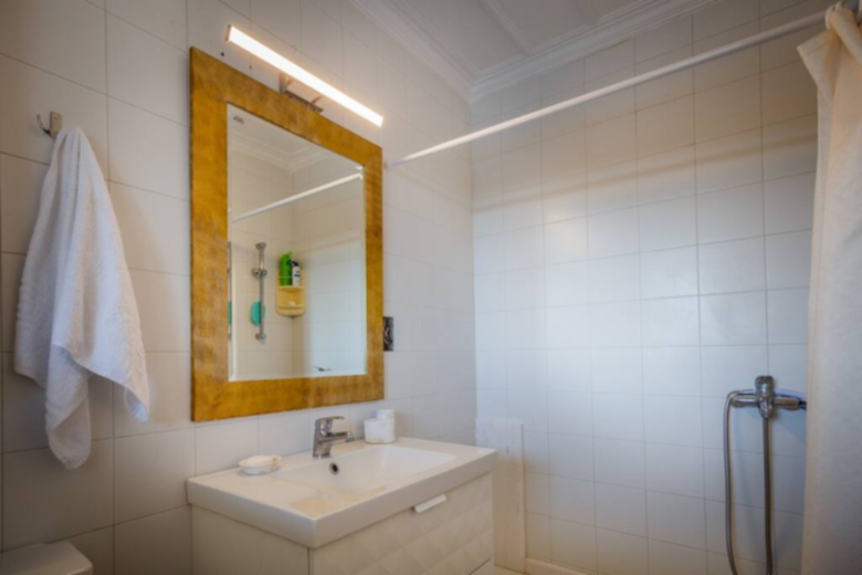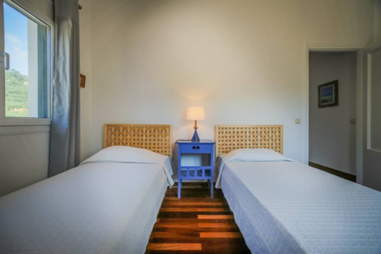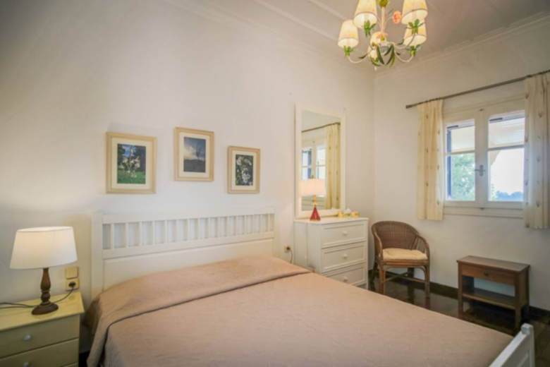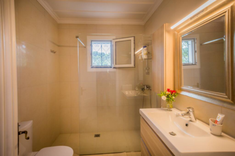 A staircase leads to the first floor, with access to three bedrooms and a bathroom with a walk in shower. The master bedroom has its own private bathroom with a walk-in shower, a double bed and two balcony doors to enjoy the view and the balcony. Of the other two bedrooms, one has a double bed and the other two single beds. However, all 4 bedrooms in Villa Verdi are air conditioned and supplied with wardrobes or drawers.