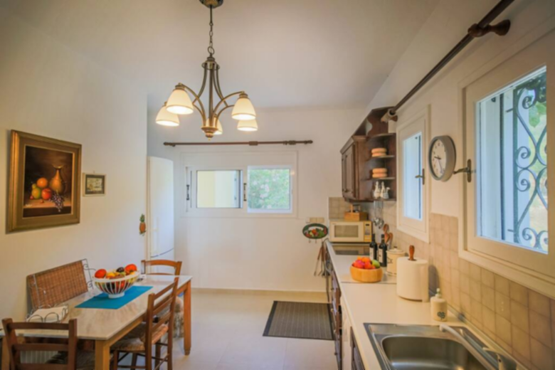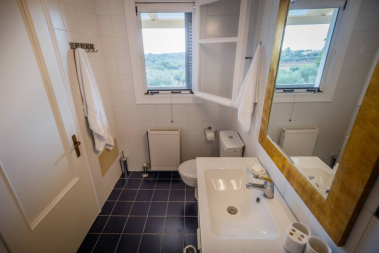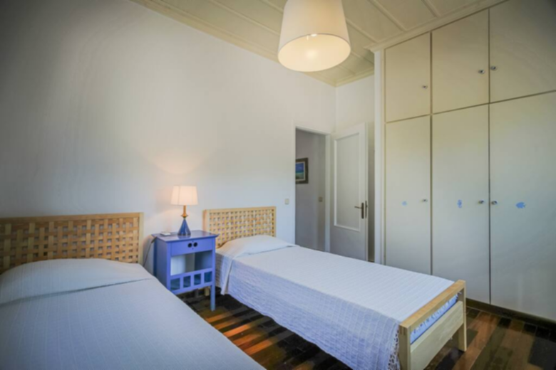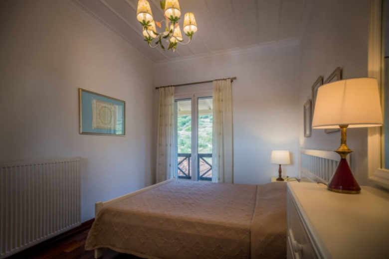 This amazing summer Villa, expands to two floors. On the ground floor, there is a well-equipped kitchen with a small dining table, cozy seating areas for your reading time, an inviting lounge room with views over the pool and a dining area, ideal place for the first spring and autumn evenings. Of course, for the warm summer evenings, just off the living room, on the porch overlooking the pool, another table was prepared for enjoying conversations while you enjoy the food and Zakynthian wine to the sounds of crickets and cicadas. At the same level, there is a bathroom with a walk-in shower and one bedroom with double bed and access to the terrace.