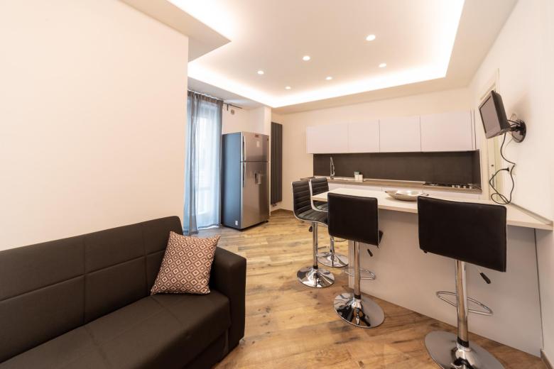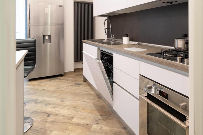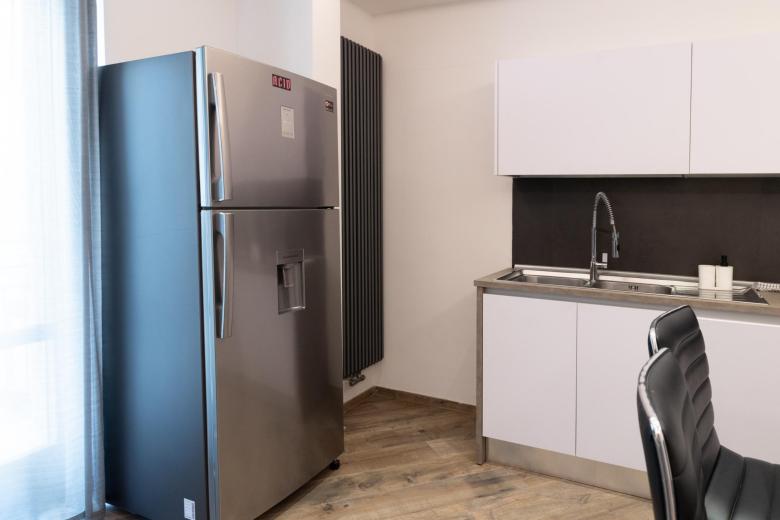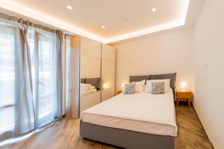 Every detail is designed for convenience: the fully equipped kitchen offers an oven, stovetop, refrigerator with freezer, dishwasher, tableware and a dining table. Independent air conditioning and heating ensure year-round comfort, while a flat-screen TV with wireless connection and an additional TV in the bedroom provide entertainment. The modern bathroom, complete with shower and bidet, includes a hair dryer, washing machine, and iron—ideal for a long-term stay.