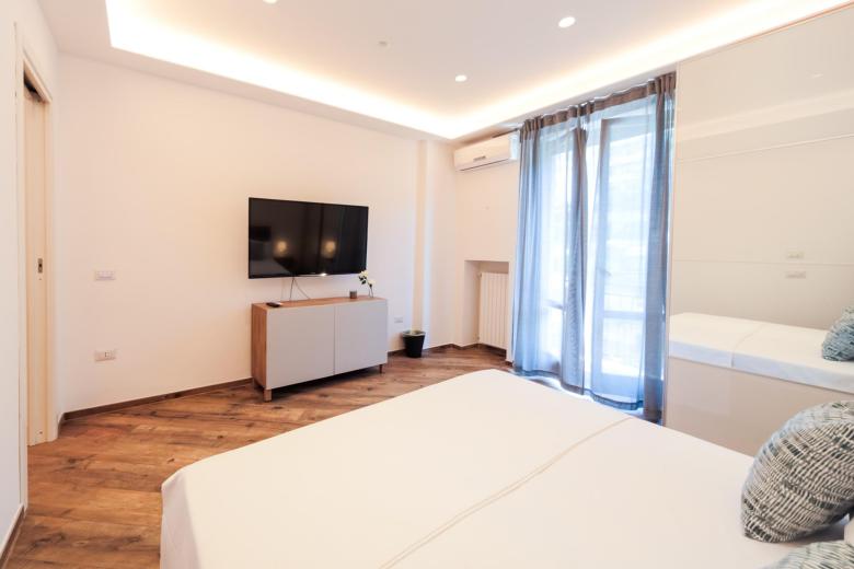 The spacious bedroom features a double bed with soft linens and extra blankets, while the open-plan living room and kitchen include a single sofa bed for a third guest. A balcony with a pleasant city view floods the space with natural light and captures the vibrant atmosphere of Salerno.